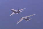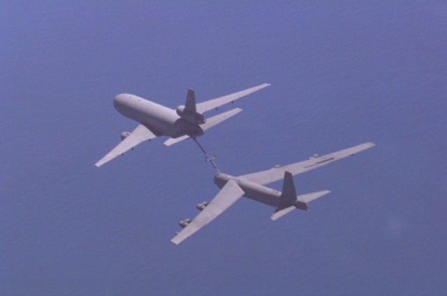 The KC-10 does two things extremely well ... it gives gas, and takes gas. If we aren't refueling other planes, we are taking on more fuel ourselves ... we can carry 340,000 lbs of fuel (50,000 gallons). Here we are refueling a B-52H bomber. |